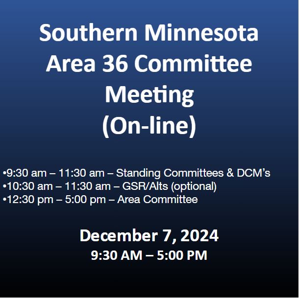 The last Area 36 committee meeting of the year will be held on-line on December 7th. GSR’s, Officers and Chairs from District 14 are expected to attend however, the meeting is open to anyone who has an interest. For the agenda and virtual meeting information please use the following link.