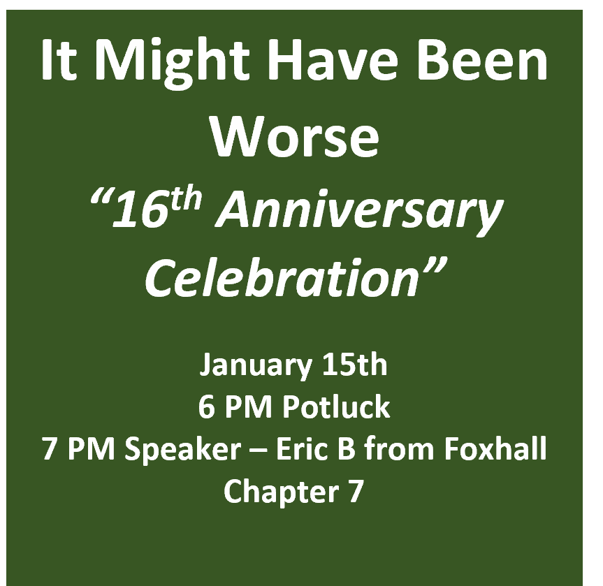 1/15/2025 – It Might Have Been Worse – 16th Anniversary Celebration December 19, 2024January 20, 2025District 14 Area 36 Click on image for flyer Join us for a potluck to celebrate our 16th anniversary. Wednesday, January 15, 2025 beginning with a Potluck at 6:00PM and a speaker (Eric B – Foxhall Chapter 7) at 7:00PM. Like Loading... Related