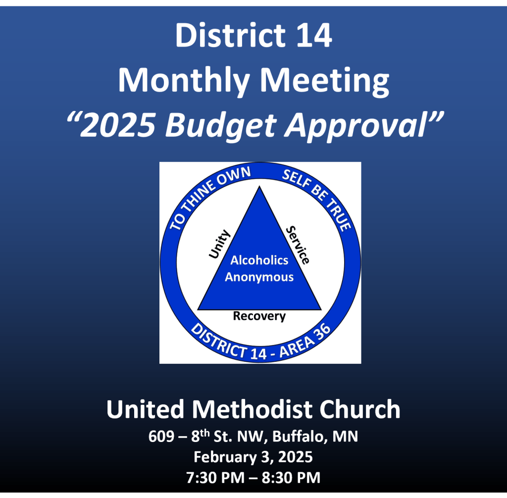 The next District 14 monthly meeting will be held February 3rd at the United Methodist Church in Buffalo at 7:30 PM in the fellowship hall. District 14 Officers, Chairs, and GSR’s please plan to attend.