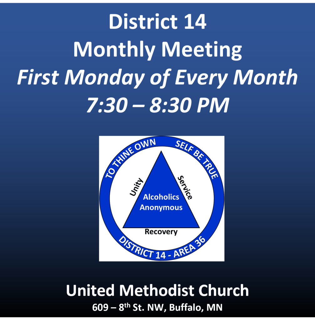 Mark your calendars, the next District 14 monthly meeting will be held May 5th at the United Methodist Church in Buffalo at 7:30 PM in the fellowship hall. District 14 Officers, Chairs, and GSR’s please plan to attend.