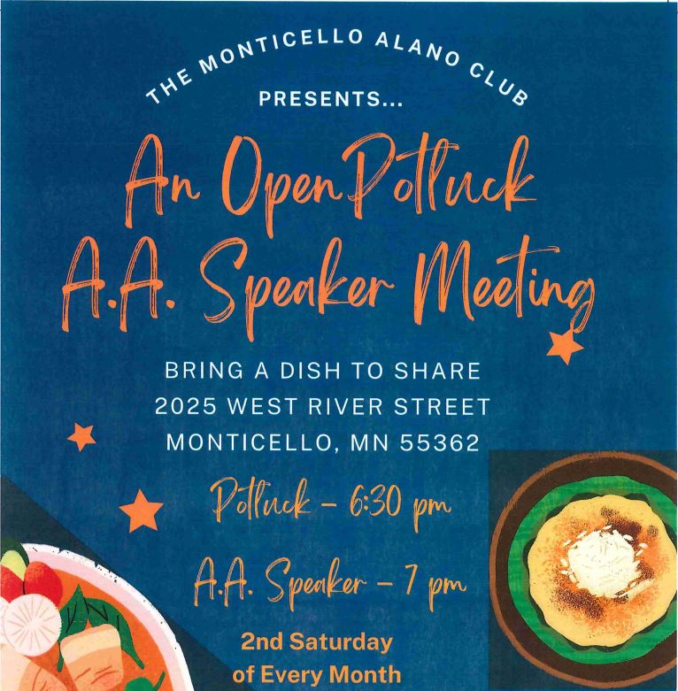 07/12/2025 – Monticello Alano Club Monthly Potluck and Speaker Meeting July 4, 2025July 13, 2025District 14 Area 36 The Second Saturday of every month the Monticello Alano Club holds a potluck and speaker meeting. Be sure to put it on your calendar. Come out to share in fellowship and hear as others share their experience, strength, and hope! Like Loading... Related