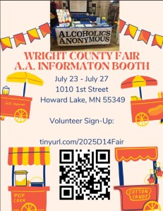 District 14 AA will once again be staffing a booth at the Wright County Fair. We are in search of volunteers who are willing to work in the booth. Volunteers just need to be present to hand out pamphlets and talk to folks about AA. If you are interested in volunteering you can follow this link to sign up. You can also contact the master of the schedule, Alan S on 612-865-8810.