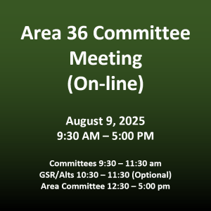The next Area 36 Committee meeting will be held on Saturday August 9th from 9:30 AM to 5:00 PM. This will be an on-line meeting. Credentials for the on-line meeting and agenda will be published on the Area website. You can go there by clicking the image above.
