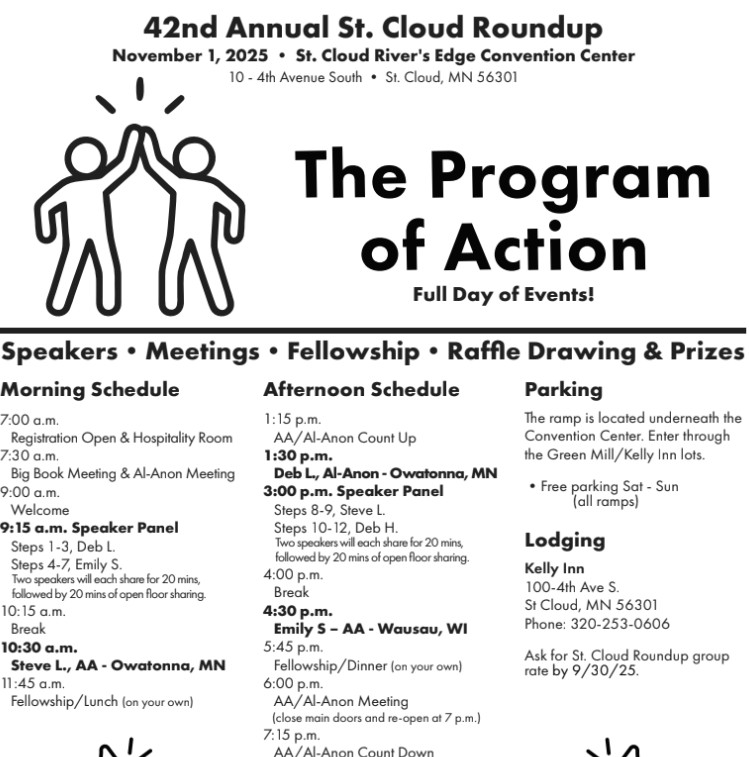 11/01/2025 – The 42nd Annual St. Cloud Roundup October 14, 2025November 3, 2025District 14 Area 36 The Program of Action, A full day of events. Speakers Meetings Fellowship Raffle and Prizes Event Flyer Like Loading... Related