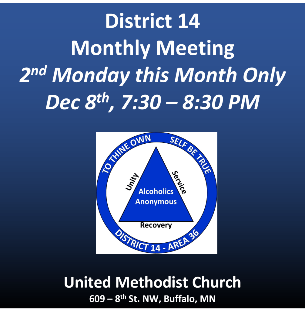 The next District 14 monthly meeting will be held Monday December 8th at the United Methodist Church in Buffalo. The meeting will begin at 7:30 PM in the fellowship hall. District 14 Officers, Chairs, and GSR’s please plan to attend.