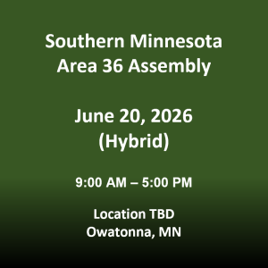 The June Area 36 Assembly meeting will be held on Saturday June 20th from 9:00 AM to 5:00 PM. This will be a hybrid meeting. Credentials for the on-line meeting and agenda will be published on the Area website prior to the meeting. Navigate to the Area events website by clicking the image above.